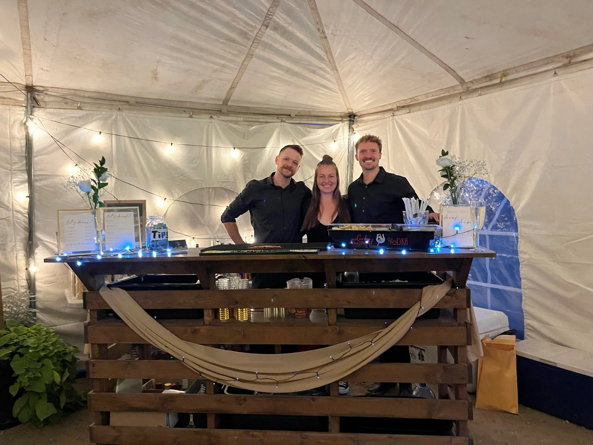 Three people standing behind a bar counter at a party or event, smiling for the photo inside a decorated tent with string lights and floral decorations.